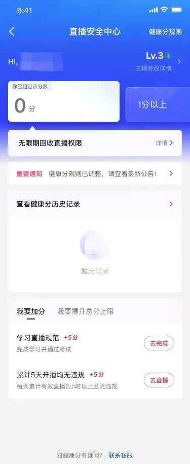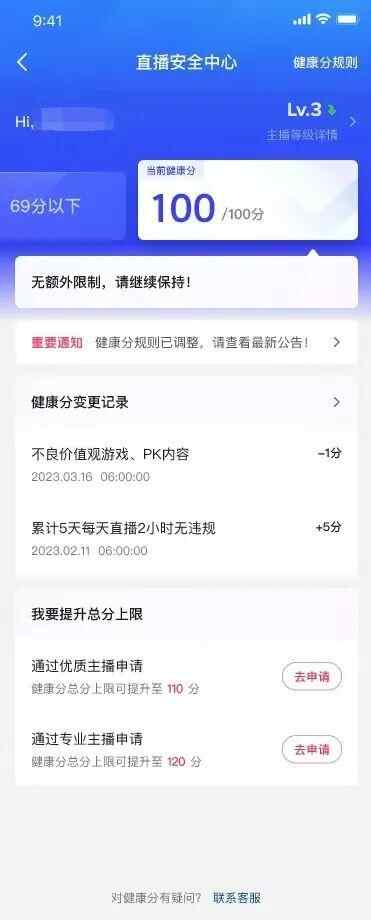 健康分加分渠道和方式保持不变,通过相应主播资质申请的主播,主播当前分值不变,总分上限进行相应的调整。加分方式为:无违规加分、教育扣分减免、申诉回分、认证激励等。