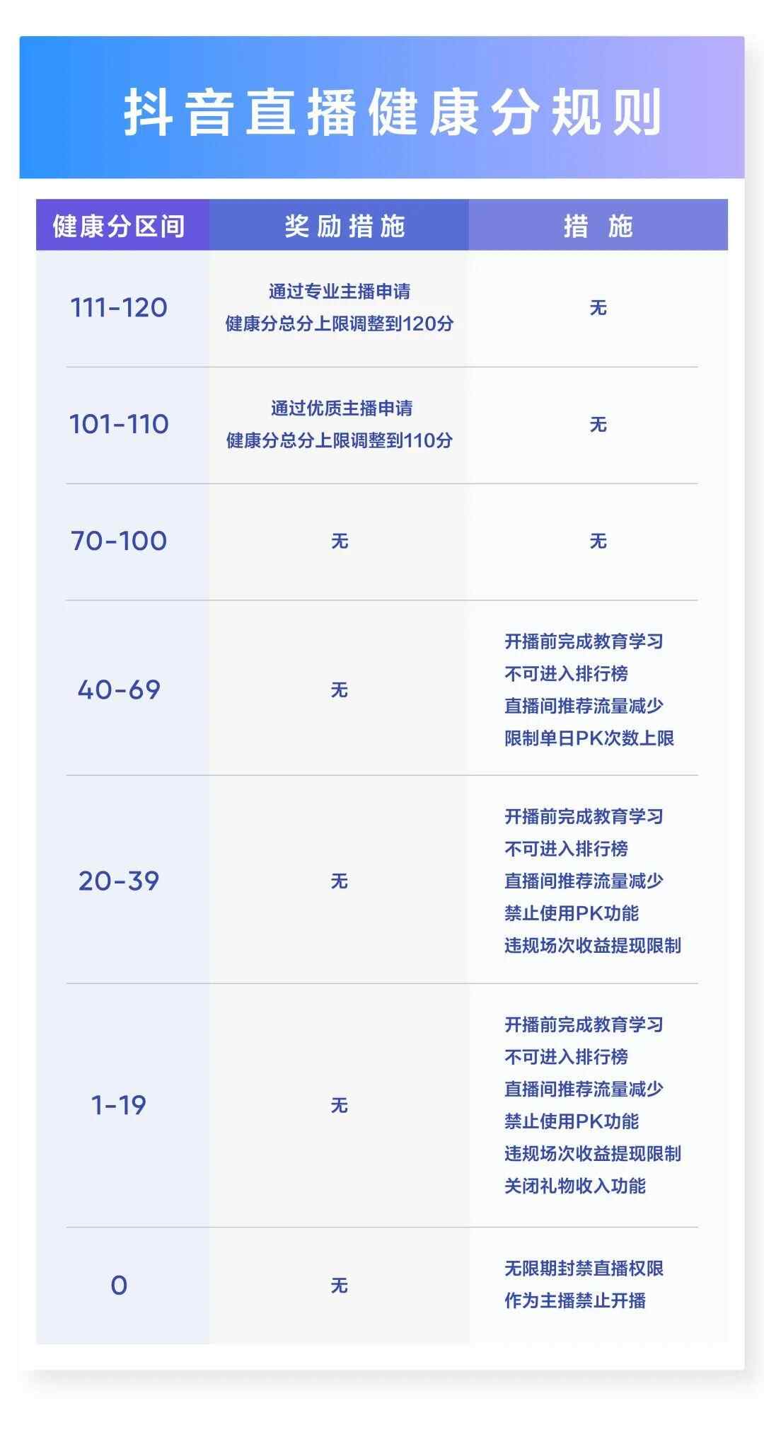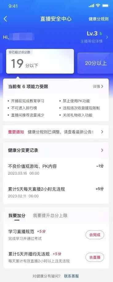惩戒措施上,主播健康分如低于40分,开播前需完成教育学习,不可进入排行榜,直播间推荐流量减少,限制单日PK次数上限等。如低于20分,将在前述管理措施的基础上关闭礼物功能,主播将无法获得打赏收入,违规收入也将被禁止提现。