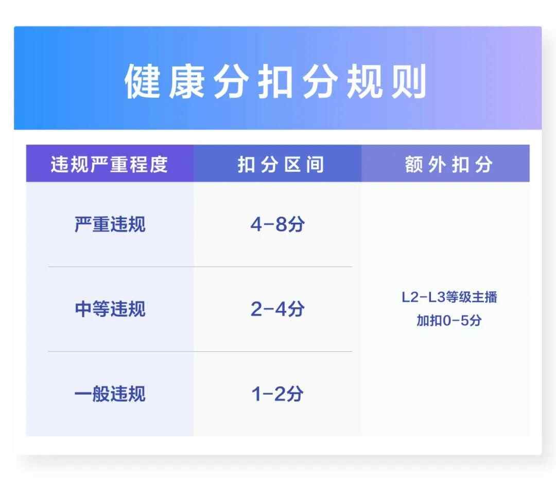 此外,考虑到违规行为对平台和观众的影响,针对粉丝数或直播间平均观看人数高的主播(Lv.2-Lv.3等级主播),平台将额外多扣减1-5分健康分。