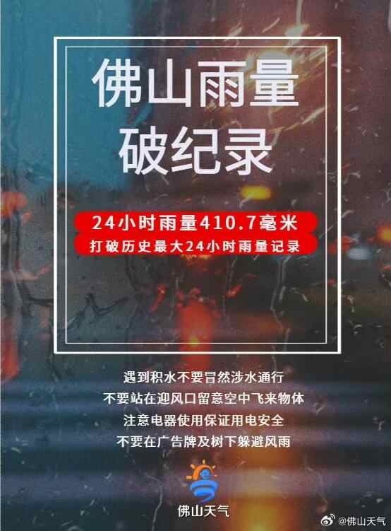 另据佛山市气象台统计,9月7日8时至8日8时,佛山市出现大暴雨、局地特大暴雨,全市平均面雨量为156.6毫米,最大24小时降雨量为410.7毫米,出现在禅城区石湾镇街道,打破了历史最大24小时雨量记录(404.4毫米);最大12小时降雨量为317.6毫米,历史排名第二。27个自动站录得250毫米以上降雨,286个站点录得100毫米以上降雨。