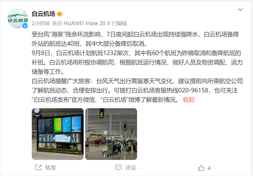 白云机场提醒广大旅客:台风天气出行需留意天气变化,建议提前向所乘航空公司了解航班动态、合理安排出行。可拨打白云机场客服热线020-96158,也可关注“白云机场发布”官方微信、“白云机场”微博了解最新情况。