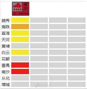 目前番禺和南沙区暴雨红色,海珠区暴雨橙色,越秀、天河、荔湾、白云区暴雨黄色预警信号正在生效中。预计未来三小时,广州中南部降雨仍将持续,部分时段雨势较大,请注意做好相关防御工作。