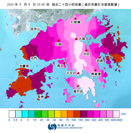 截至8日中午的过去24小时里,香港天文台总部录得雨量超过600毫米,而7日晚11时至8日零时所录的“一小时降雨量”高达158.1毫米,这是香港自1884年以来的最高纪录。记者会上,陈国基宣布“极端情况”状态继续延长至8日晚12时。