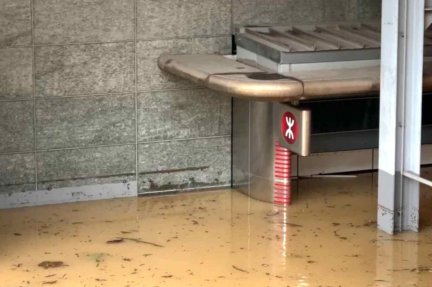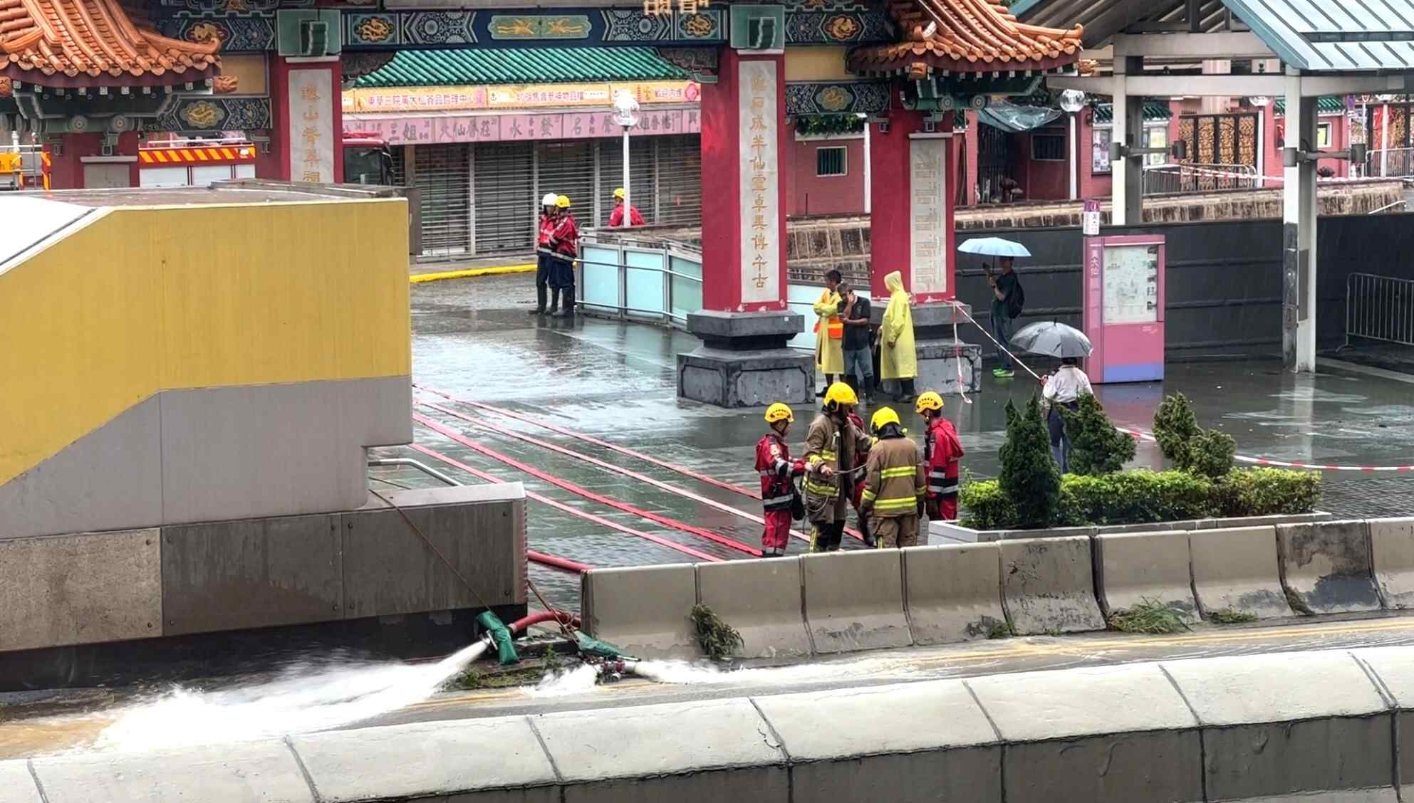 黄大仙区一带的水浸严重,港铁黄大仙站和附近商场一度被积水淹至地下一层。港铁观塘线石硖尾至彩虹站因此封闭停运。8日下午5时左右,记者在现场发现,黄大仙水浸区域的积水仍未退去,有关部门应急救援人员正在全力排涝。
