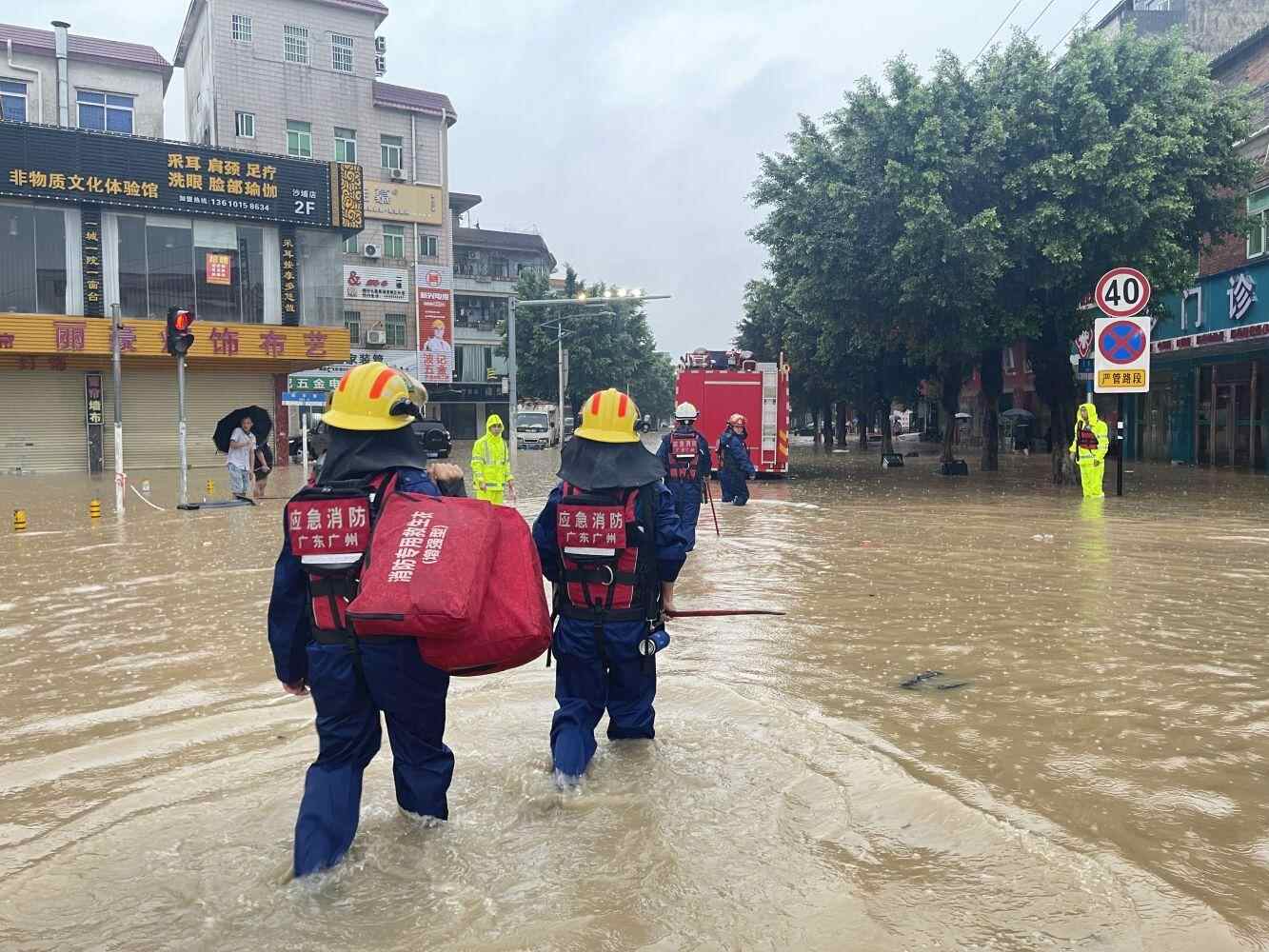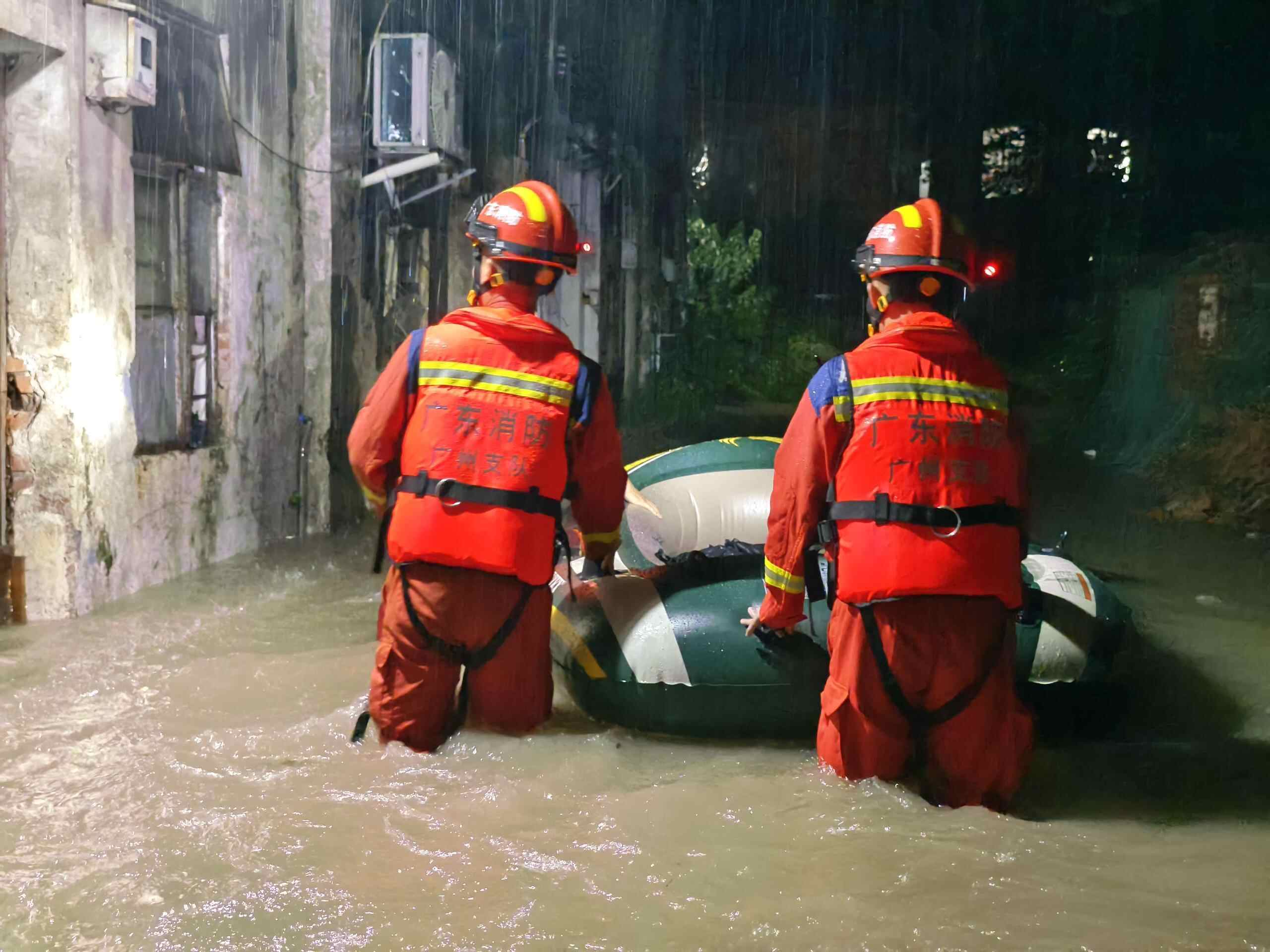 在广州,7日至8日,番禺区消防部门接报,有多名群众被困家中或积水路面,其中包含多名行动不便的老人。消防员携带应急救援装备迅速出动,连续作战。在增城区新塘镇民营西路,7日晚上10时许,有群众报警称被水围困,现场积水已有1.2米深。由于人数较多,位置分散,很难确认被困人员具体位置。增城区消防救援大队新塘消防救援站派出两艘橡皮艇,携带器材在路面进行搜索,最终找到9名被困者所在位置,顺利将全部人员救出。