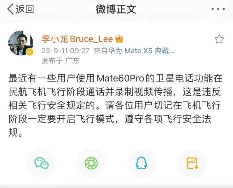 华为终端CTO李小龙9月11日发布微博表示:“最近有一些用户使用Mate60 Pro的卫星电话功能在民航飞机飞行阶段通话并录制视频传播,这是违反相关飞行安全规定的。请各位用户切记在飞机飞行阶段一定要开启飞行模式,遵守各项飞行安全法规。 ”