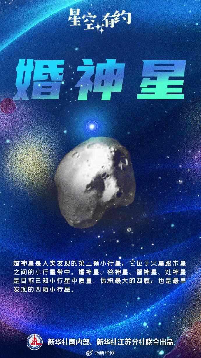 紫金山天文台科普主管王科超介绍,婚神星是人类发现的第三颗小行星,它位于火星跟木星之间的小行星带中。婚神星、谷神星、智神星、灶神星是目前已知小行星中质量、体积最大的四颗,也是最早发现的四颗小行星。