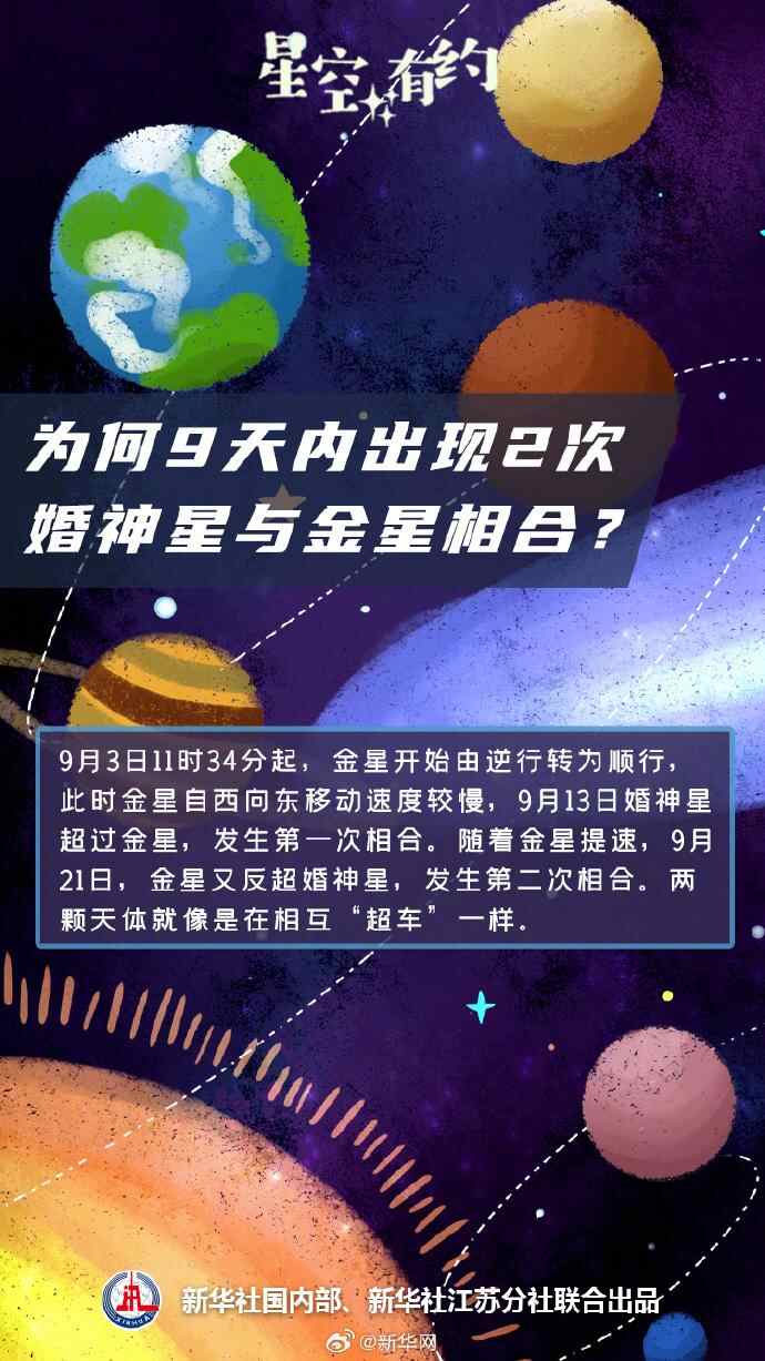 “短时间内发生两次婚神星与金星相合比较罕见。”王科超解释说,9月3日11时34分起,金星开始由逆行转为顺行,此时金星自西向东移动速度较慢,9月13日婚神星超过金星,发生第一次相合。随着金星提速,9月21日,金星又反超婚神星,发生第二次相合。两颗天体就像是在相互“超车”一样。