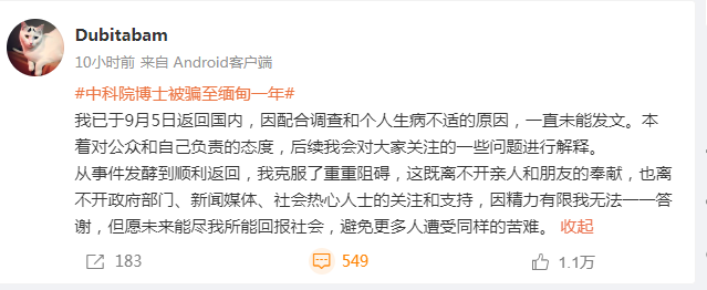 早前,中科院博士张某(化名)被困缅甸一事备受关注。中国驻泰国大使馆8月26日发布情况通报称,泰警方成功寻获张某。9月11日晚,当事人张某发文称,已于9月5日返回国内,后续会对大家关注的一些问题进行解释。