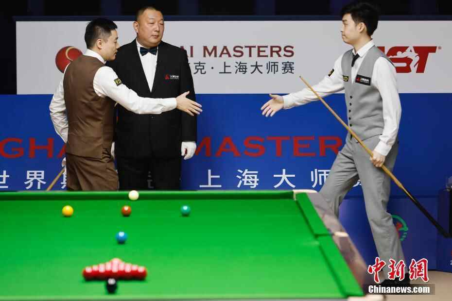 9月11日晚,2023世界斯诺克·上海大师赛在上海体育馆开杆。今年,赛事依旧延续24人邀请赛形式,参赛阵容由世界排名前16的选手,世界排名最高的4名中国选手(若在前16排名中则名额顺延),和展现中国斯诺克新生力量的4位“00后”外卡选手组成。图为开幕式后,丁俊晖和斯佳辉上演“中国德比”。中新社记者 殷立勤 摄