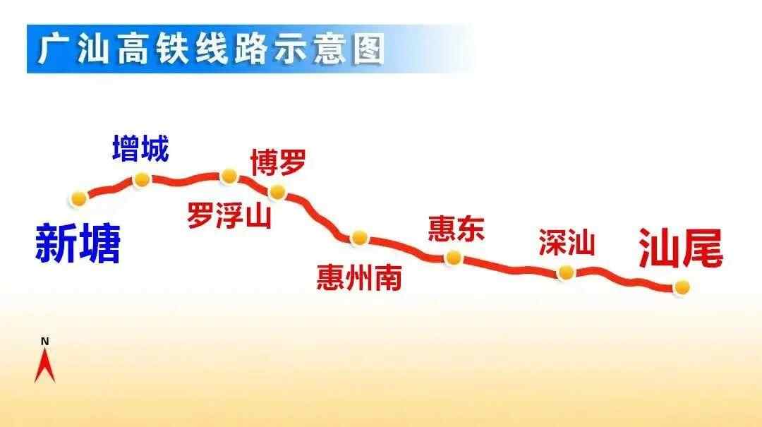 广汕高铁西起广州新塘站,途经广州、惠州、深汕合作区、汕尾4个市区,东至汕尾站。线路全长202公里,设计时速350公里,共设新塘、增城、罗浮山、博罗、惠州南、惠东、深汕、汕尾8座车站,其中,新塘站和汕尾站为既有车站,新塘站站房为拆掉重建,其他6座车站为新建车站。