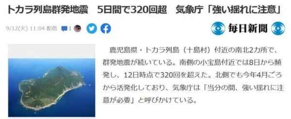 报道援引日本气象厅的消息称,此次群发地震主要发生在吐噶喇群岛中的小宝岛近海,截至当地时间12日上午9时,当地5日内观测到的有感地震已达329次。报道称,在此次群发地震区域以北100公里的海域,从4月开始也已观测到146次地震。