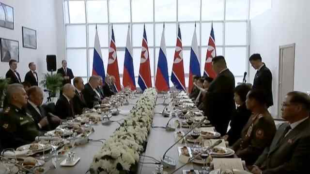 9月13日,俄罗斯总统普京与到访的朝鲜劳动党总书记、国务委员长金正恩在俄远东地区阿穆尔州的东方航天发射场会面,并举行简短会谈。会谈后,俄罗斯政府为金正恩举行国宴。