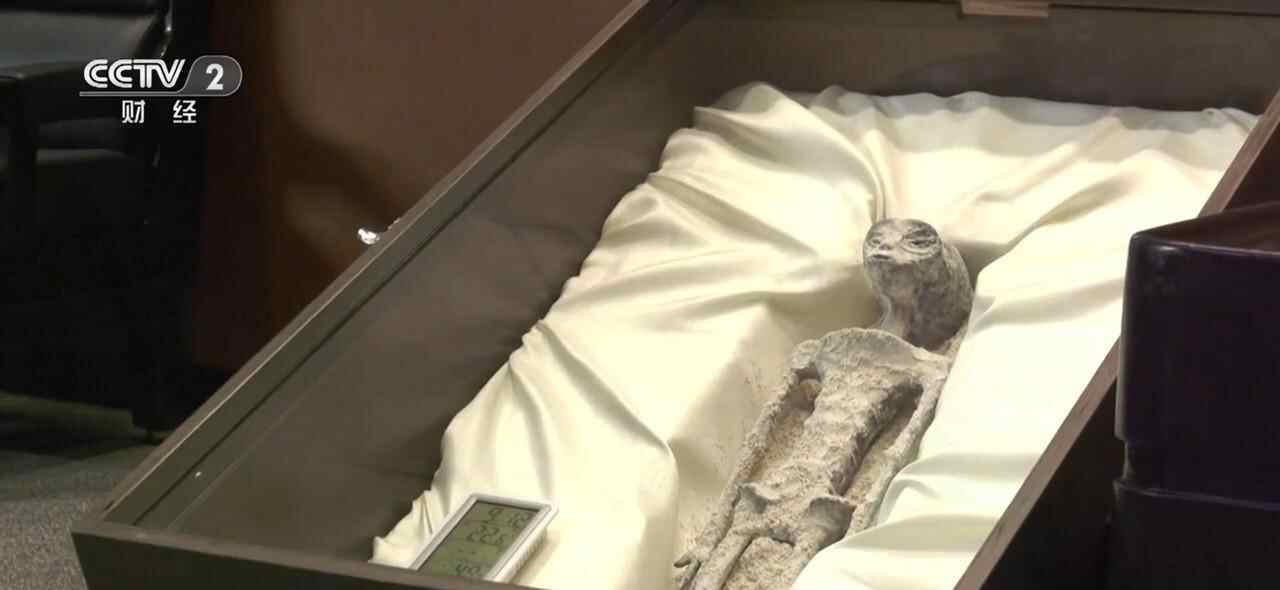在当天的听证会上,墨西哥议会对外展出了两具疑似“外星生物”的遗骸。这两具遗骸于2017年在秘鲁被发现,距今分别有1800年和700年。遗骸的头部细长,每只手有3根手指。从遗骸中提取的DNA也显示,它们并非人类。会上还展示了遗骸的X光图像,科学家称其中一具遗骸内有“蛋”,并且两具遗骸都植入了由包括锇在内的极其稀有金属制成的植入物。