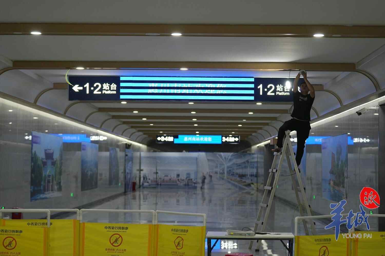 羊城晚报全媒体记者9月14日探访发现,惠州南站已经全部完工,站内的一些硬件设施,如安检设备和候车椅等都已安装完毕。记者看到多名建设者正对施工过程中造成的一些磕缺进行修补,另有一些工作人员在打扫卫生迎接正式运营。此外,候车大厅的多家商铺也在抓紧进行装修作业。