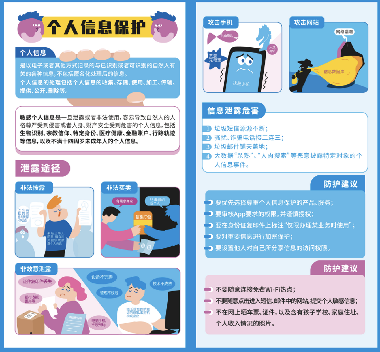一是做好个人信息防护。优先选择尊重个人信息保护的产品及服务;对重要信息进行加密保护,设置他人对自己所分享信息的访问权限;审核APP要求的权限,并谨慎授权;不要随便连接免费Wi-Fi热点,更不要随意点击进入短信、邮件中的网站,提交个人敏感信息。