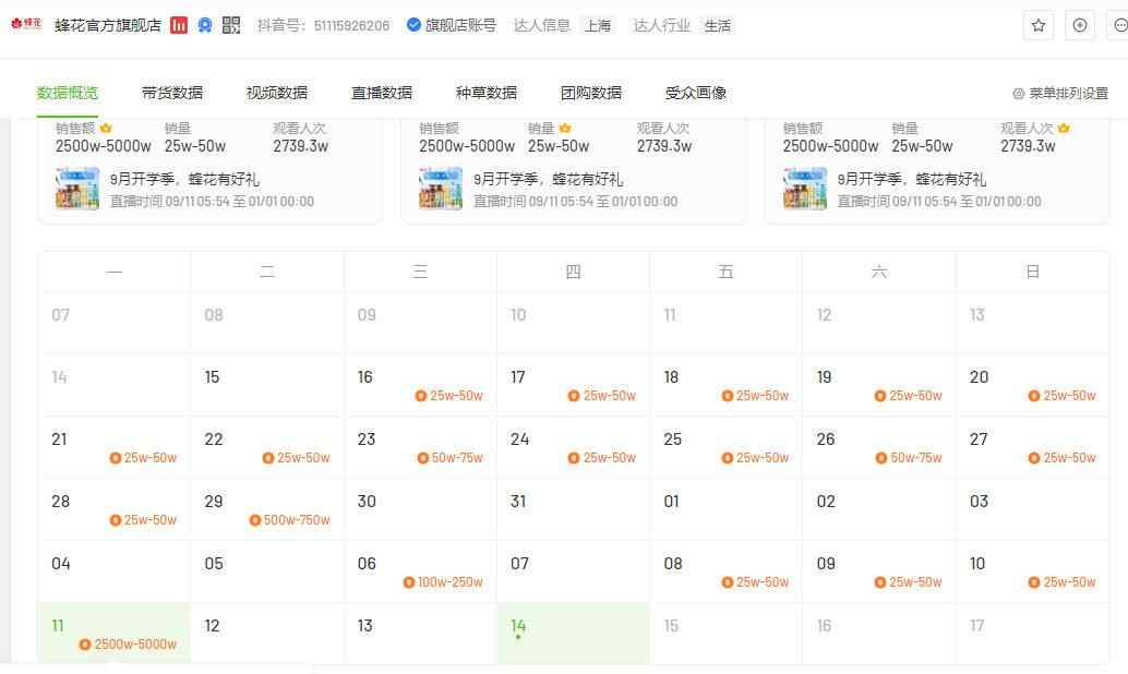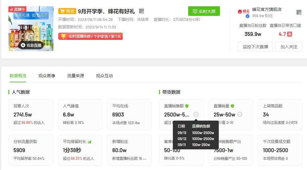 品牌直播间也迎来了销量、销售额的翻倍增长。据飞瓜数据,蜂花9月11日开播的直播间,目前销售额已超2500万元,销量也超过了25万单。此前,蜂花直播间的销售额很少超过百万。9月11日开始的这场直播已持续了三天,其销售额则是从12日开始,出现了10倍的暴涨,一直持续到了13日。