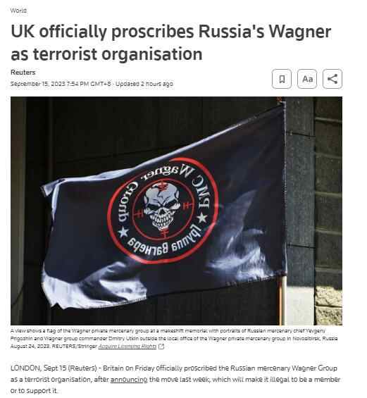 据路透社报道,当地时间15日,英国正式将俄罗斯私营军事承包商瓦格纳集团列为“恐怖组织”,成为该组织成员或支持该组织都将被视为违法。