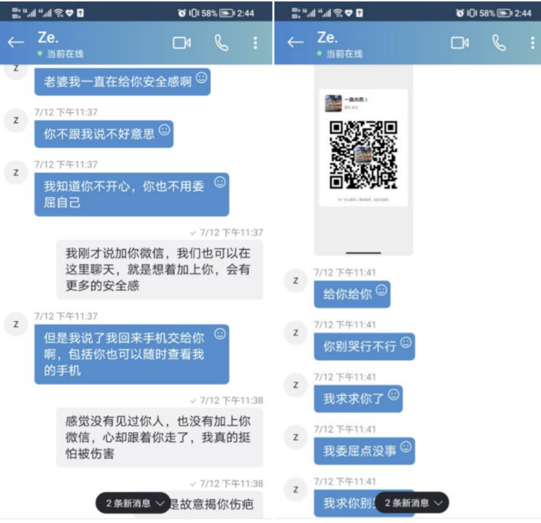 雪儿提供的部分聊天记录显示,对方很会说话,比如会嘴甜地喊“老婆”,经常说“我爱你”。双方发生争执,他也会哄她“你别哭行不行,我求求你了,我委屈点没事,我求你别哭”。