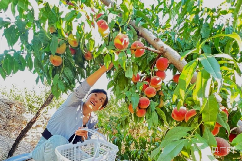 游客在昌吉市三工镇春光村种植户罗宝胜的桃园里采摘鲜桃 (央广网发 田晶 摄)
