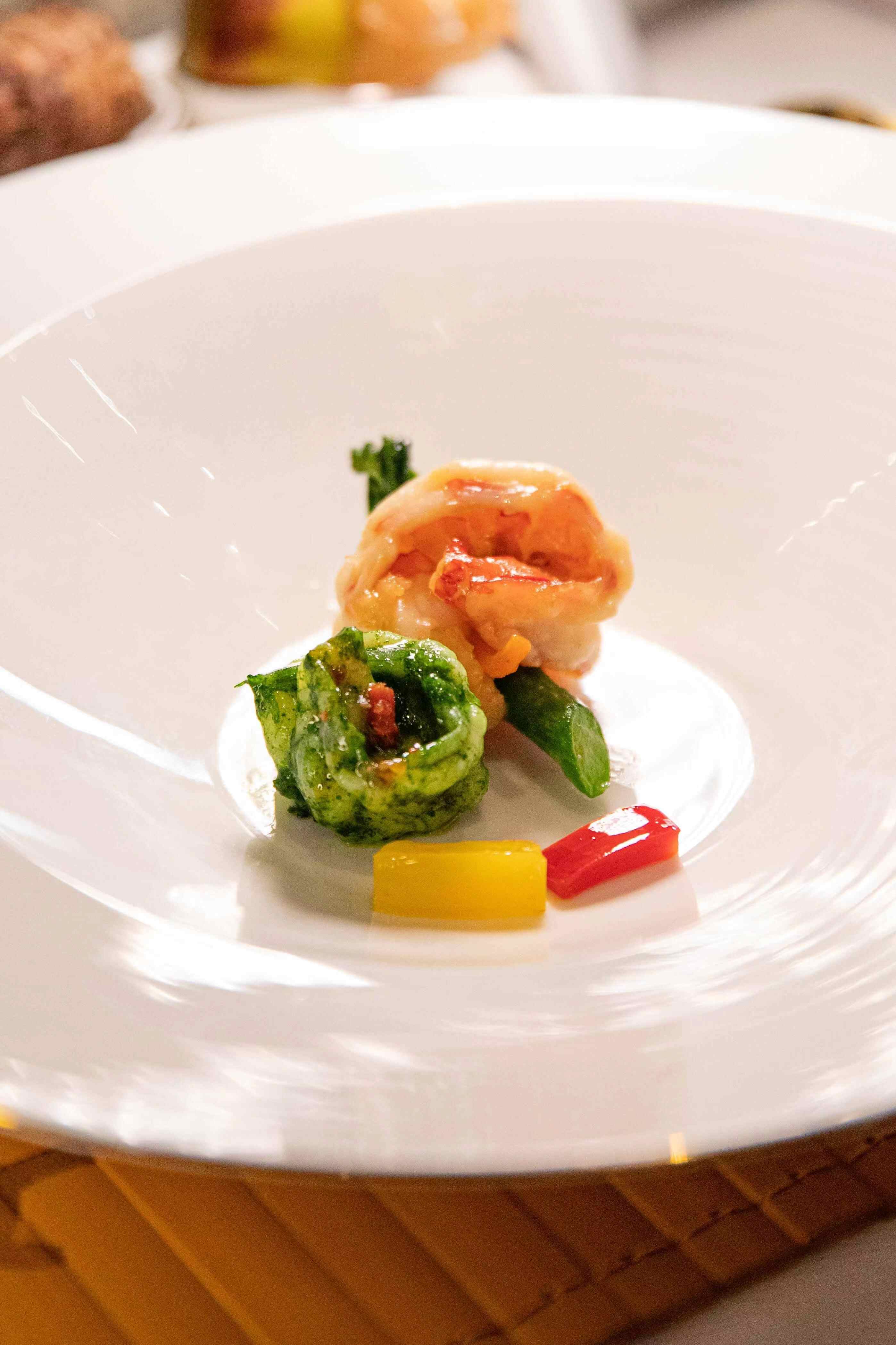 《粤咏诗宴》继续秉持粤菜文化中传承守正和融合创新的精神,菜式凸显诗情雅意的同时,也充分展现传统粤菜烹饪的精华。例如,吸满汤汁的竹笙落入盘中,形如一柄如意,配以清爽的碧绿荷兰豆,此谓“碧玉逢生”;一根菜心嫩芽自洁,在白如玉的虾仁之间贯通而出,恰似美人发上的玉簪,“玉簪步摇”可谓名副其实。