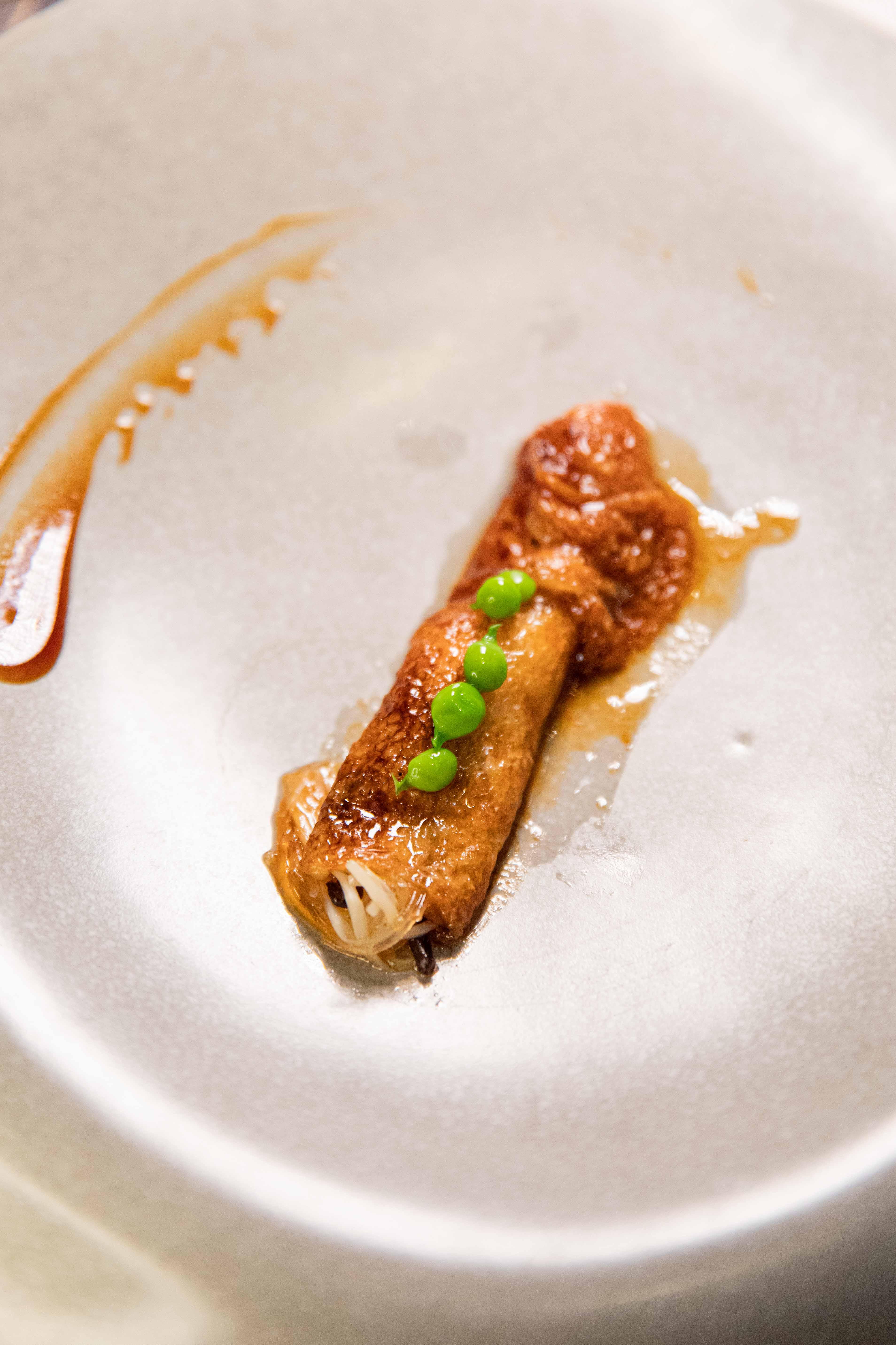 本季融合创新也是可持续发展的关键。“乳燕新浴”便是本季菜品中寓传统于创新的代表之作。脱胎于传统粤菜当中的“凤吞翅”,即以去骨整鸡为外壳,酿入煨好的鱼翅进行长时间炖煮,成本过高,技艺繁复,也不符合当前绿色环保的社会导向,因此改作“鸽吞燕”,以鸽代鸡,加入燕窝、雪耳和火腿。放入混合娟姗牛奶的猪骨汤中炖煮一个小时四十二分钟,使汤汁雪白鲜甜,乳鸽似初新出浴,形神俱佳。