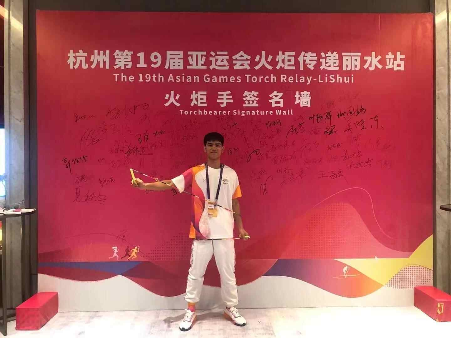 9月16日,杭州第19届亚运会火炬传递已到达浙江省丽水市,来自广州花都籍世界跳绳冠军陈嘉伟是当天火炬传递的第16棒。