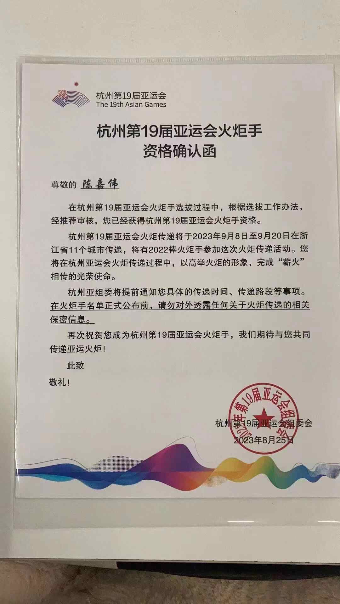 陈嘉伟父亲在接受羊城晚报全媒体记者电话采访时表示,陈嘉伟在9月初收到了杭州第19届亚运会火炬手的资格确认函,在本次杭州亚运会火炬传递过程中,以高举的火炬的形象,完成“薪火相传的光荣使命”。