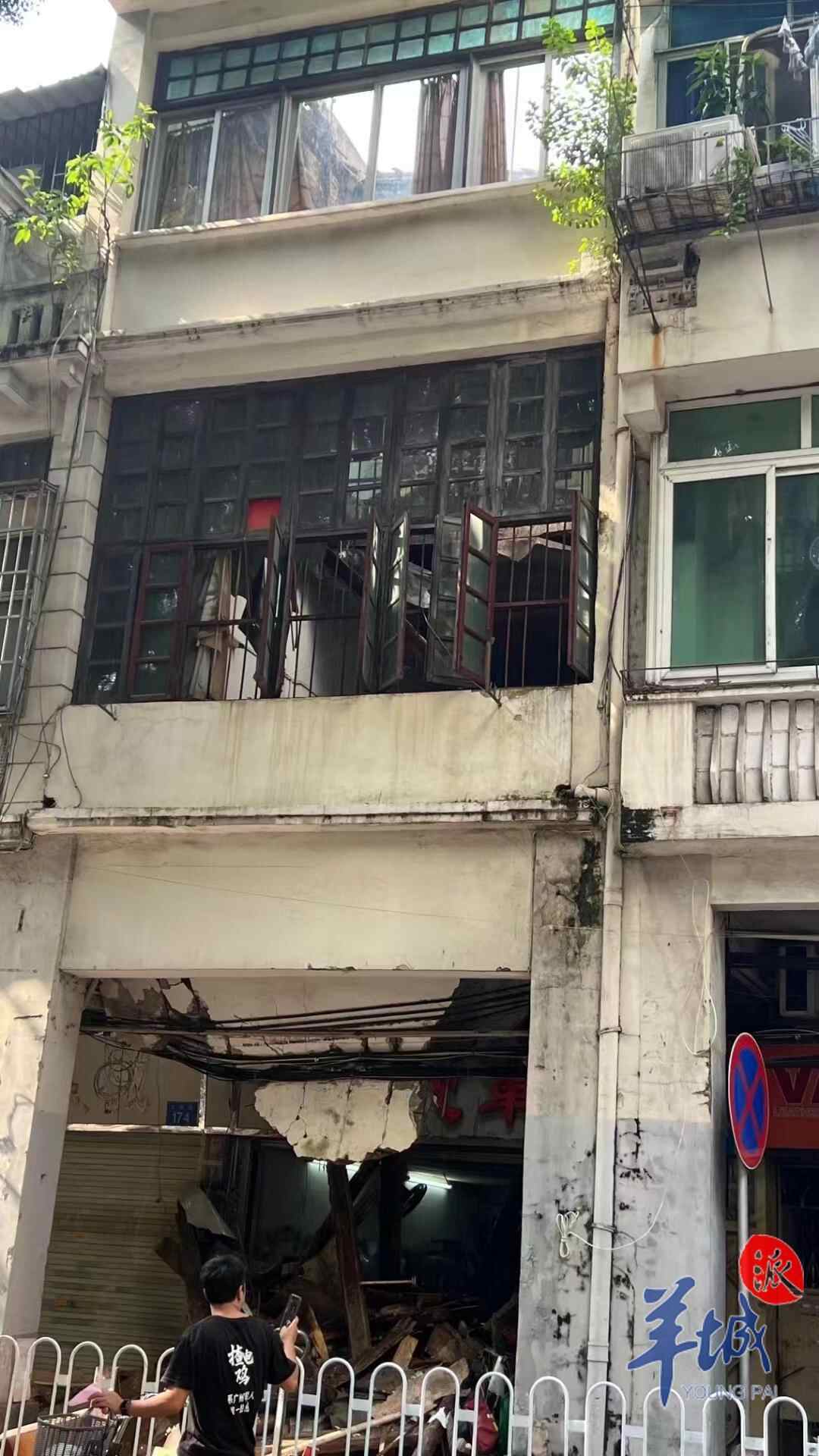 从外观看,该骑楼一共三层,首层为经营机械设备的档口,二楼、三楼为普通民房。据周围居民反映,由于楼房破损严重,楼上已经十余年没有人居住,只有档口仍在开业。记者现场看到,此次事故主要为三楼楼顶地板发生断裂,同时贯穿二楼地板,即一楼天花板,导致骑楼出现一个“大洞”。