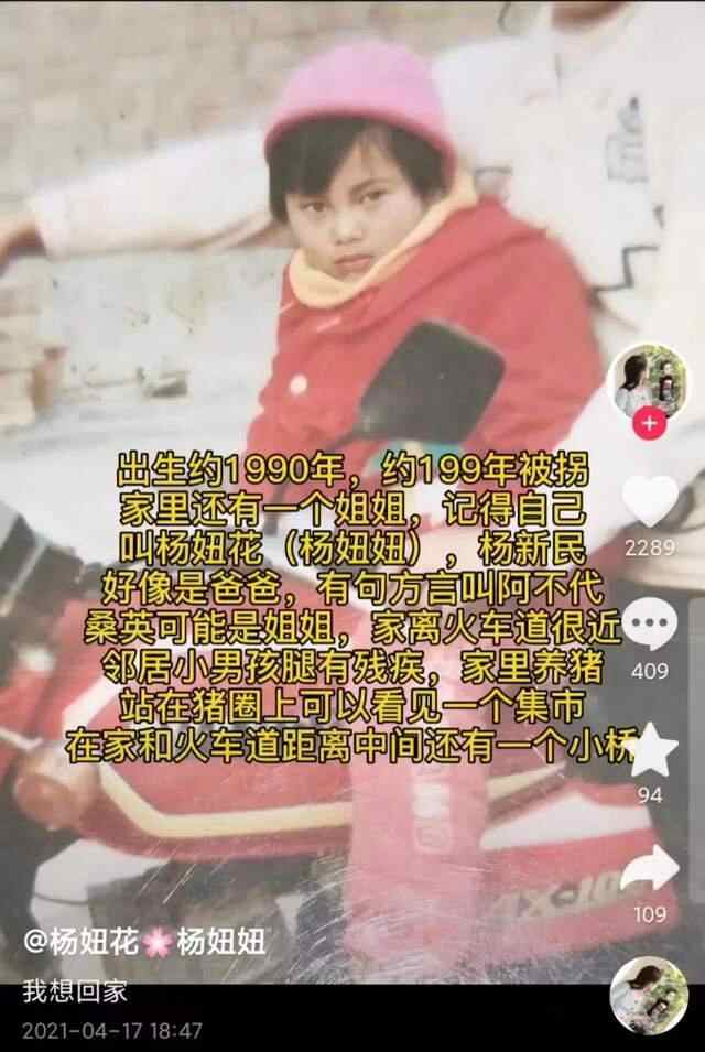 2021年4月17日,杨妞花在短视频平台上发布寻亲信息,照片是其到养父家一个月的时候拍的。