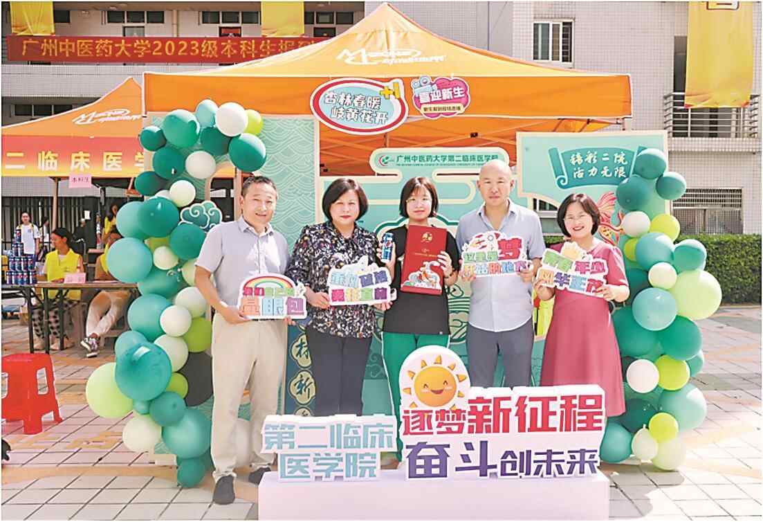 在学校迎新展位上,“中医药文化体验区”吸引了许多新生与家长驻足。第二临床医学院2023级中医学的赵雁纯同学正在体验耳穴贴压,这是她成为“广中医人”后在校园与中医药的第一次零距离接触。