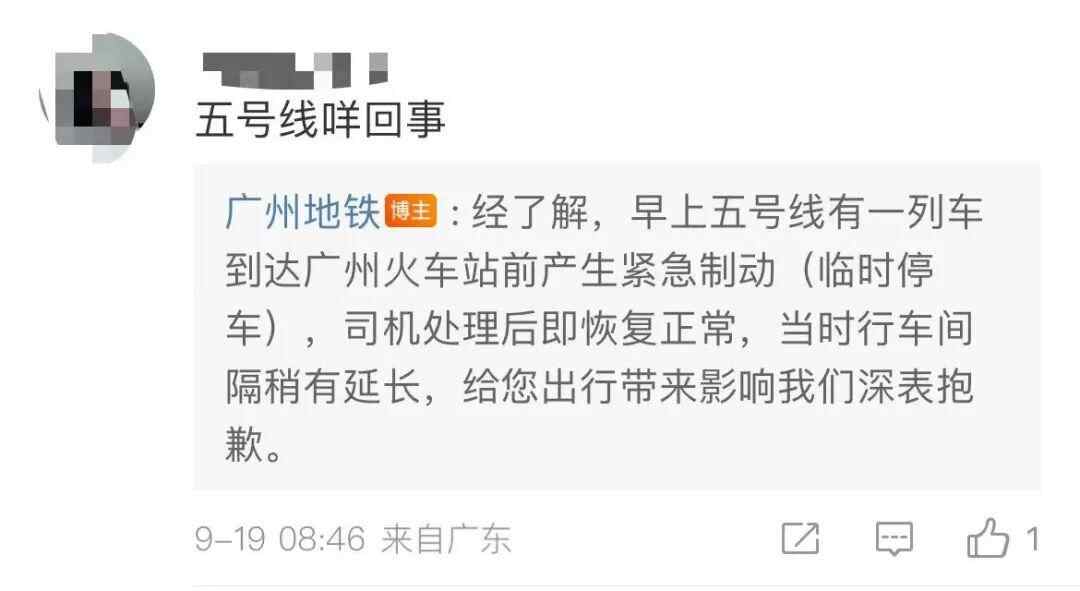 对此,广州地铁回复网友:五号线一列列车在到达广州火车站前产生紧急制动(临时停车),经列车司机处理后恢复正常。其间,广州地铁五号线行车间隔稍有延长。对于给乘客出行带来的影响,广州地铁深表抱歉。