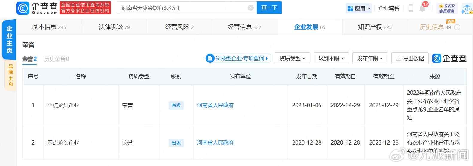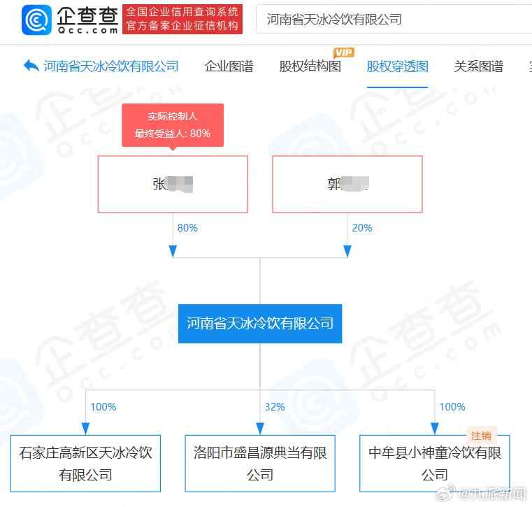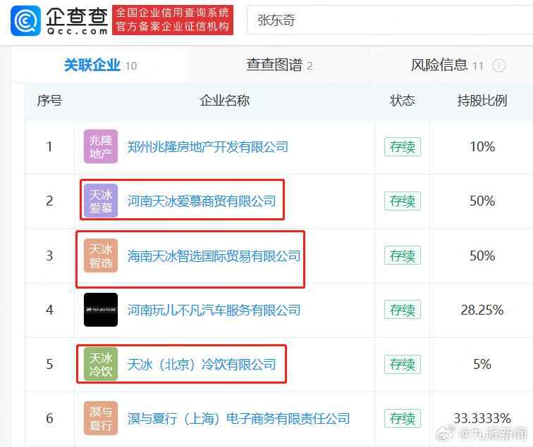 企查查APP显示,天冰冰淇淋关联公司为河南省天冰冷饮有限公司,成立于1999年9月,注册资本500万元,法定代表人张东奇,由两位自然人共同持股,为省级重点龙头企业。该公司对外投资3家,其中2家为存续状态。企查查信息显示,创始人张东奇及股东等均关联多家天冰公司,如海南天冰智选国际贸易有限公司等。