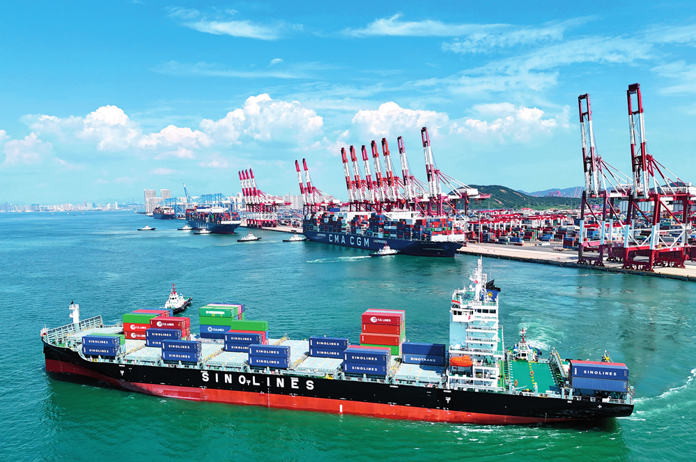 “中外运海口”轮从山东港口青岛港出发,驶向印度钦奈港(2023年8月30日摄)。今年以来,山东港口青岛港新增 10 条“一带一路”航线。 张进刚摄 / 本刊
