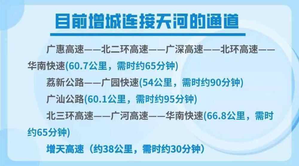 该高速公路建成通车后,从增城出发将无需绕行其他高快速路,路程缩短近30公里,用时30分钟左右可到达广州天河区。增天高速将成为连接增城、黄埔与广州中心城区的最便捷通道之一。