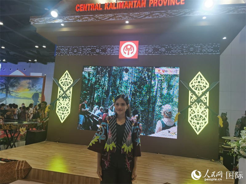 在印尼的“魅力之城”中加里曼丹省展区,到处都能看到当地的达雅克盾牌(talawang)图腾。印尼国家电视台(TVRI)中加里曼丹省新闻主播Rabeka Putri担任旅游推广大使(Putri Pariwisata)身着传统服饰向参展观众介绍中加里曼丹省的旅游景点和民俗文化。Rabeka Putri向记者表示,东博会是一个国际盛会,她希望通过这个展会让全世界的人了解印尼、了解中加里曼丹,到中加里曼丹旅游,带动当地的旅游业。