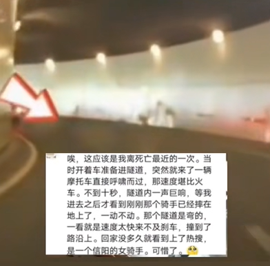 9月18日,据荔枝新闻报道,近日,网传一摩托车骑手极速穿行隧道时遇险,重庆警方证实确有事故发生,驾驶人已不幸离世。