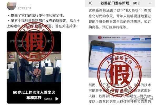 中秋国庆假期临近,不少网络平台流传“从2023年10月1日起,60岁以上老年人乘火车可以享受5折优惠”等说法。上海辟谣平台也收到粉丝留言,问是不是真的。对此,记者联系国铁集团求证获知,该说法是假的,没有此项规定。铁路部门只提供了面向儿童、学生、残疾军人、残疾旅客的票价优惠政策。
