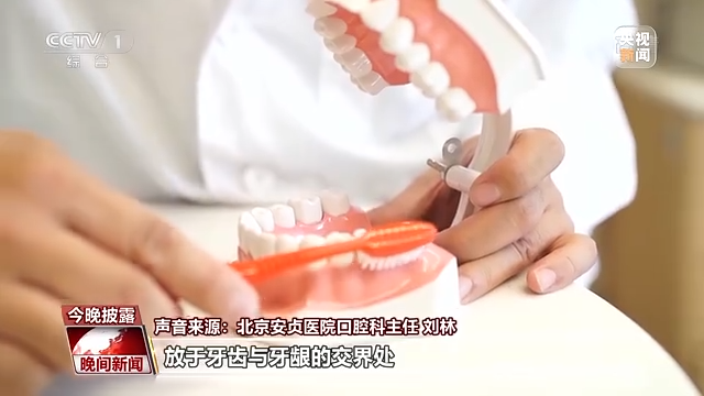 北京安贞医院口腔科主任 刘林:选择小头的软毛牙刷,我们将牙刷的刷毛与牙长轴成45度,放于牙齿与牙龈的交界处,然后水平颤动,小幅度地颤动,垂直方向刷牙。刷完颊面以后,前牙区我们把牙刷可以竖直起来,避免大幅度横着来刷牙,这个容易造成比较脆弱的牙颈部组织的损伤。