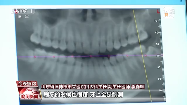 山东省淄博市市立医院口腔科主任、副主任医师 李春颖:他主要的症状就是吃饭的时候不能吃饭了,刷牙的时候也很疼,牙上全是龋洞,甚至疼得厉害的时候睡不着觉。