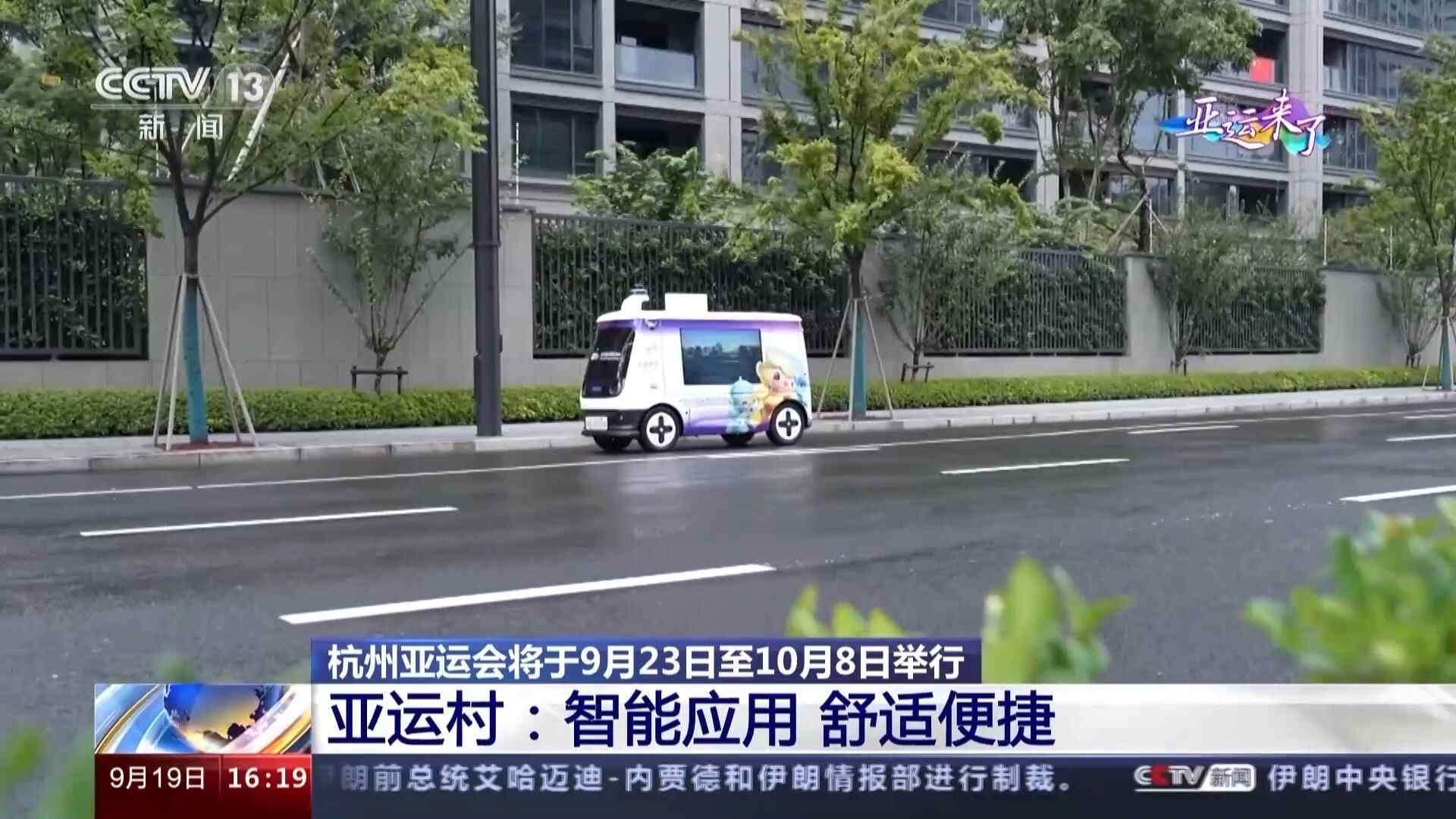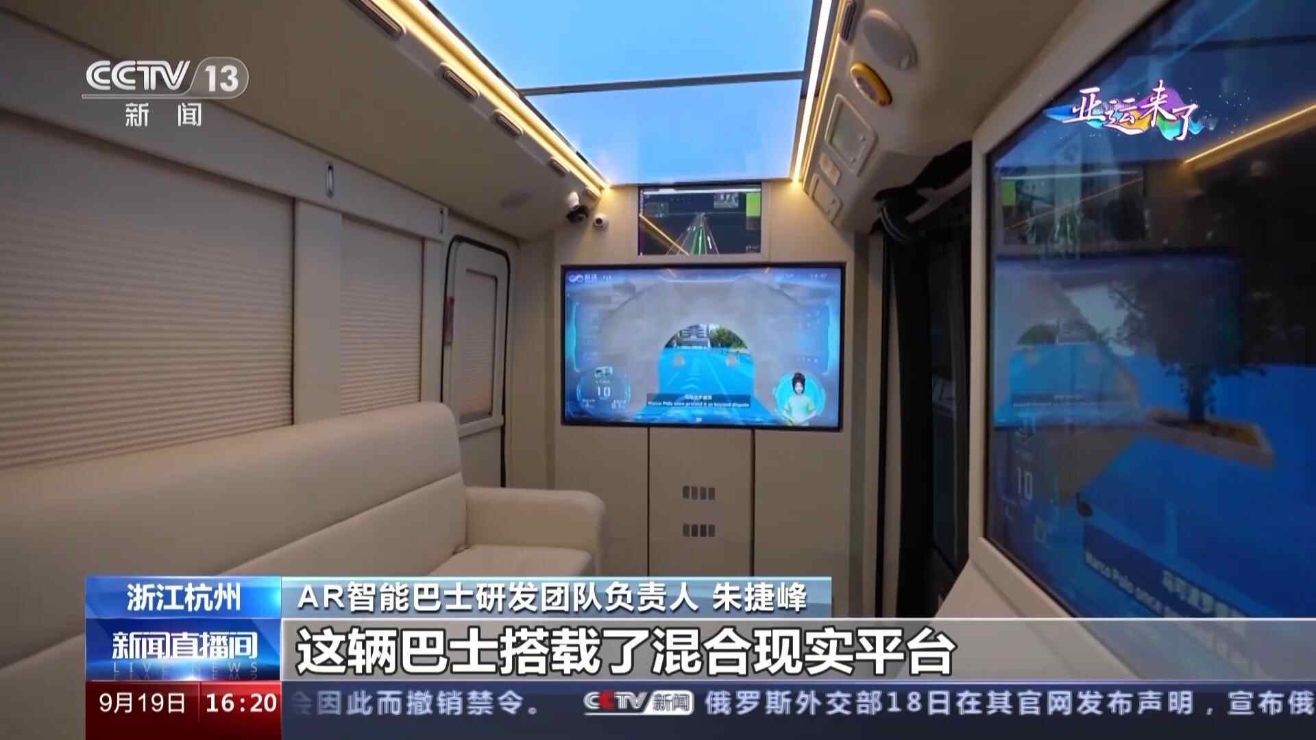 总台记者 黄珊:我现在就是在亚运村内部的一个AR智能巴士上,大家可以看到,它的内部空间非常宽敞,而且坐在车上,在全自动巡航的状态下,它能为乘客提供接驳、讲解的服务。在我的正前方有一扇特殊的窗户,它结合了车载AR功能,透过车窗,不仅能够看到车外的实时影像,还能结合虚拟场景,虚实结合,可以说非常奇妙。