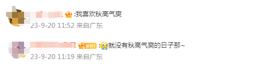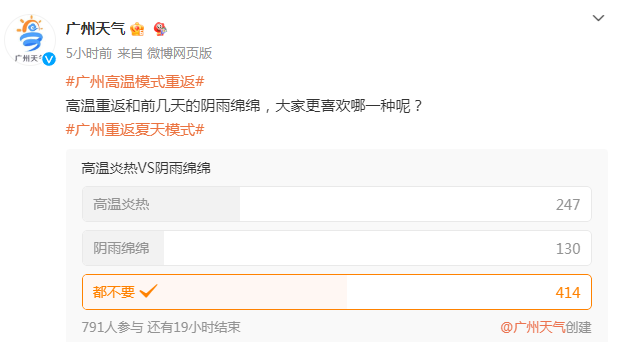阴雨不爱,高温也受不了?在@广州天气今日设置的一则投票上,在“高温重返和前几天的阴雨绵绵,大家更喜欢哪一种呢?”的问题上,参与投票的网友超半数表示“都不要”,但高温票数相对阴雨还是较多,超过3成。而在评论区,不少网友给出了自己的选择:“我喜欢秋高气爽”。