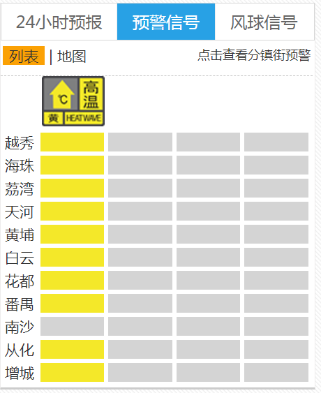 在今日13时20分的全市温度分布图上,最高气温位于增城正果镇水围村,为39℃。而在15时55分的全市温度分布图上,最高气温则位于天河区体育东路华晓街华康小学,为38.7℃,均超过38℃。