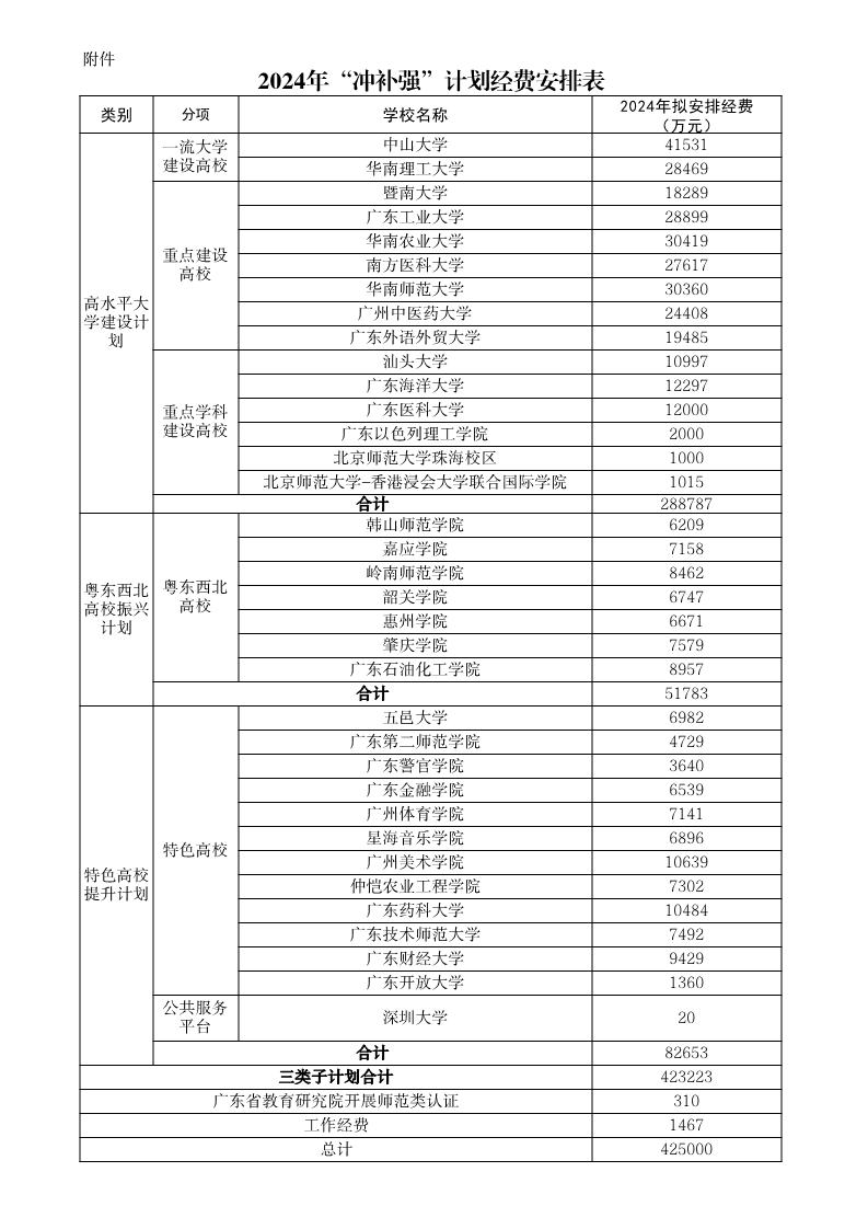 在2024年的“冲补强”方案中,此项资金除1467万工作经费外,此次资金安排分为三大类别:“高水平大学建设计划”“粤东粤西粤北高校振兴计划”“特色高校提升计划”。相比2023年,2024年新增了广东省教育研究院开展师范类认证的310万元,广州航海学院暂不在此次资金安排之列。