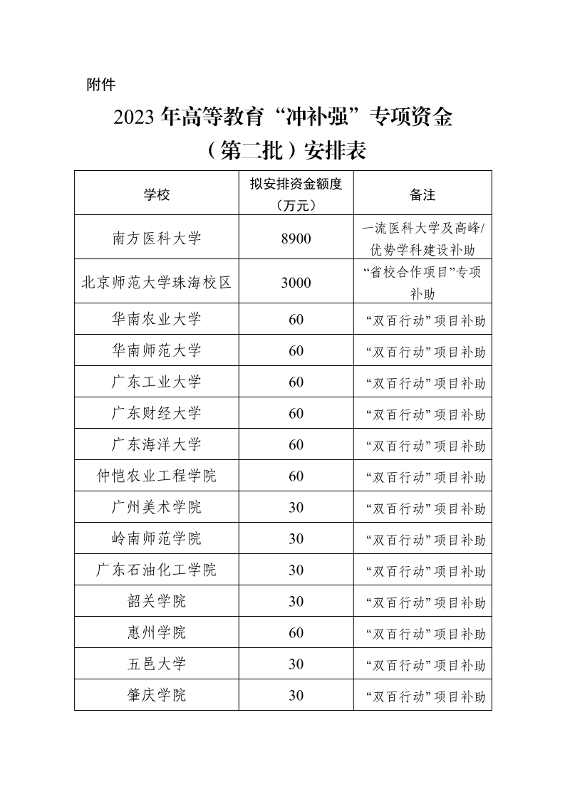 在2023年第二批“冲补强”方案中,有华南农业大学、华南师范大学、广东工业大学等13所院校拟获得30万元-60万元不等的补助。此外,还有南方医科大学一流医科大学及高峰/优势学科建设补助8900万元、北京师范大学(珠海校区)“省校合作项目”专项补助3000万元。