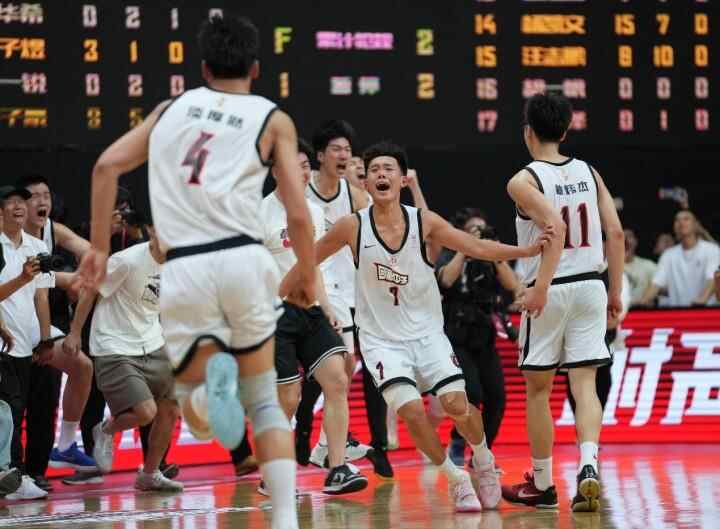 2023年5月14日,浙江临海回浦中学队球员张浩博(右二)在比赛结束后庆祝夺冠。新华社记者 孟永民 摄