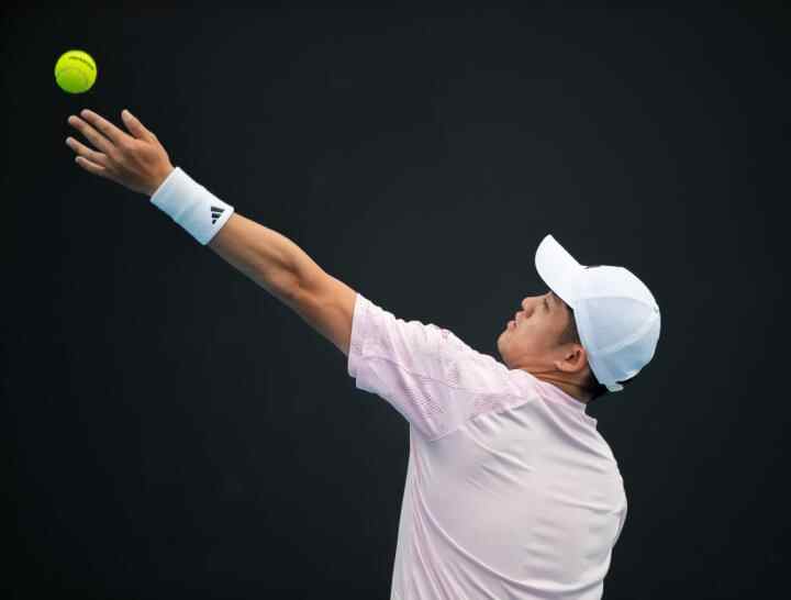 2023年1月16日,吴易昺在澳大利亚墨尔本进行的澳大利亚网球公开赛男子单打首轮比赛中发球。图源:新华社