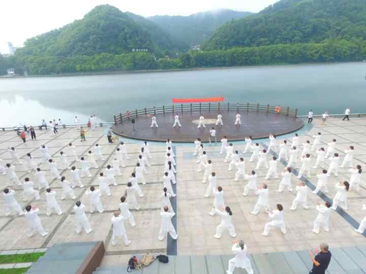 建德市新安江畔的江滨公园里,众多的健身爱好者参加跳舞、舞彩带、太极拳等项目的全民体育健身运动。潮新闻拍友 宁文武 摄