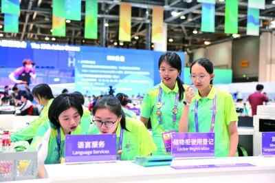 9月22日,亚运会主新闻中心的志愿者们在工作。光明日报记者杨震摄/光明图片