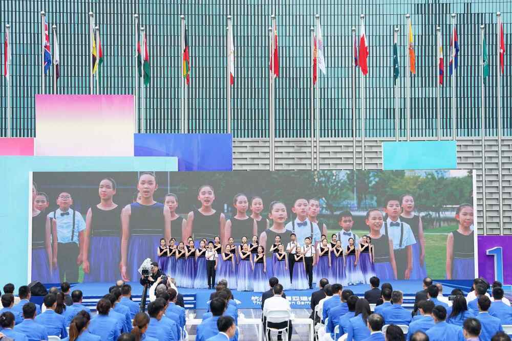 9月16日,杭州亚运会亚运村开村仪式暨中国体育代表团欢迎仪式在亚运村旗帜广场举行。图为小演员们在仪式上合唱杭州亚运会主题歌曲《同爱同在》。新华社记者杜宇摄